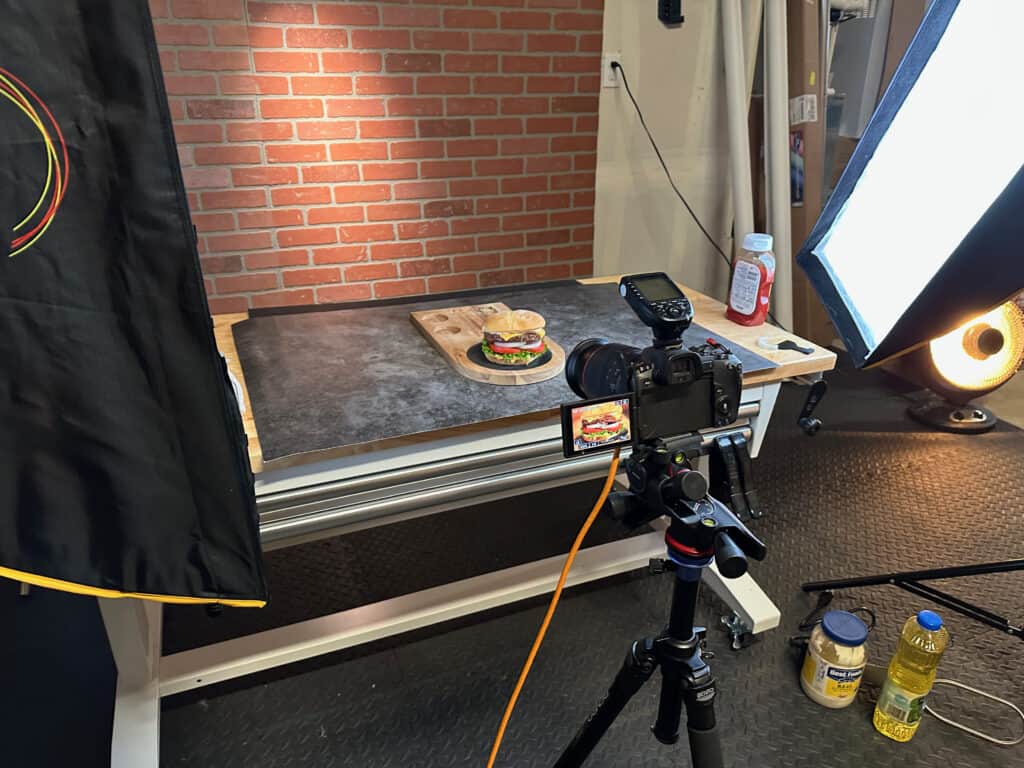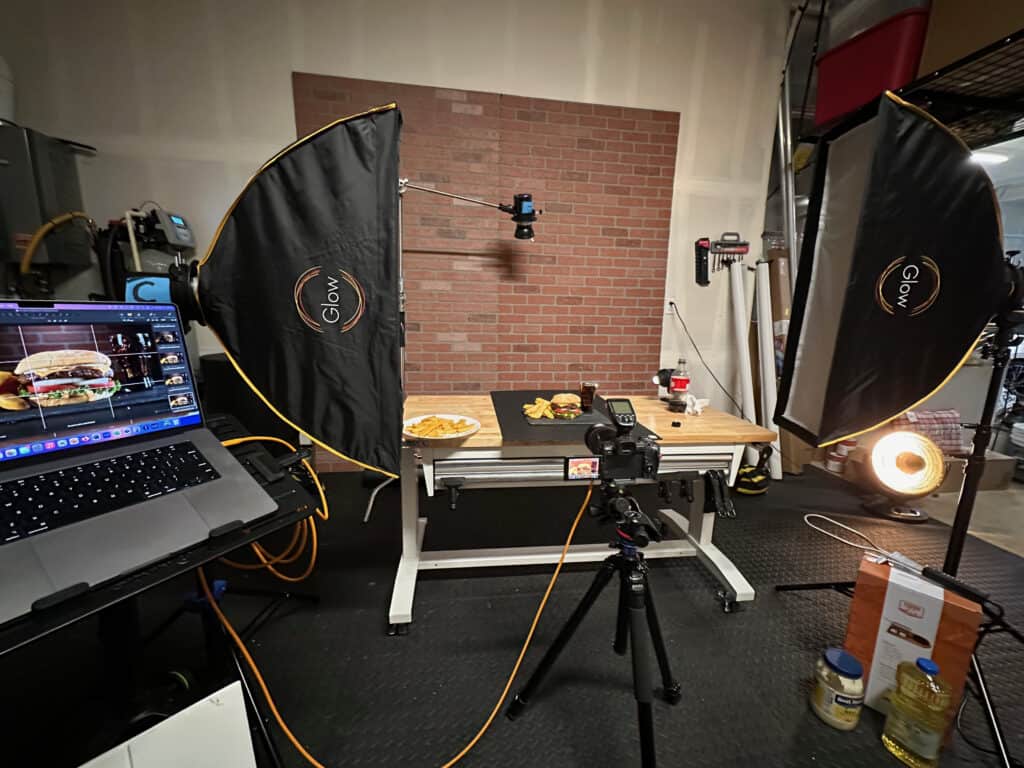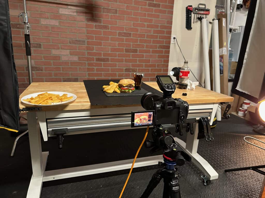 All of the images in this article were produced in a small home garage studio, using compact lights, simple modifiers, and controlled light direction. You don’t need a commercial kitchen, restaurant, or rental studio to produce professional-grade burger photography.